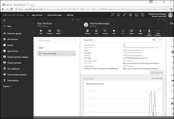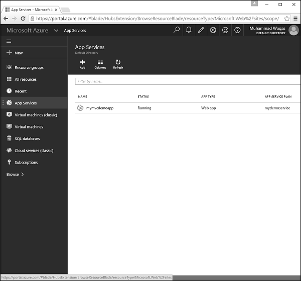 Step 12 − Now if you go to your Azure portal and click ‘App Services’, then you see that your application is deployed to Azure.