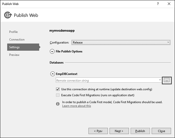 Step 7 − Click the ellipsis mark ‘…’ to select the connection string.