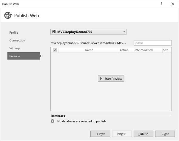 Step 13 − To check all the files and dlls which will be published to Azure, click the ‘Start Preview’.