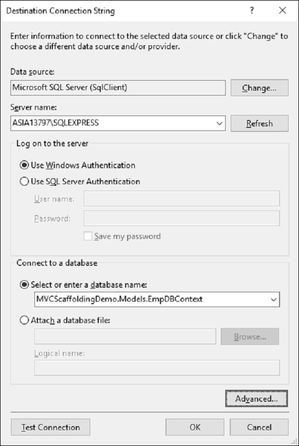 Step 8 − Select the server name and then choose the Windows Authentication option. Select the database name as well. Now you will see that the connection string is generated for you.