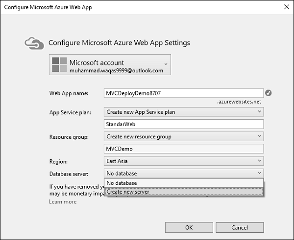 When the Configure Microsoft Azure Web App Settings dialog appears, make sure that you are signed in to Azure.