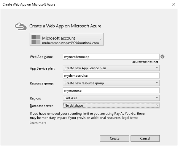 Step 5 − Enter the desired information on the above dialog such as Web App name, which must be a unique name. You will also need to enter App service plan, resource group, and then select your region.