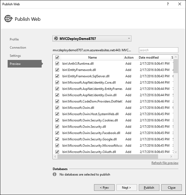 Step 10 − To check all the files and dlls which we will be publishing to Azure, click the Start Preview. Click ‘Publish’ button to publish your application.