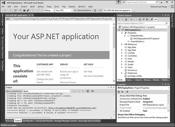 Step 14 − Click ‘Publish’ button to publish your application. Once the application is successfully published to Azure, you will see the message in the output window.